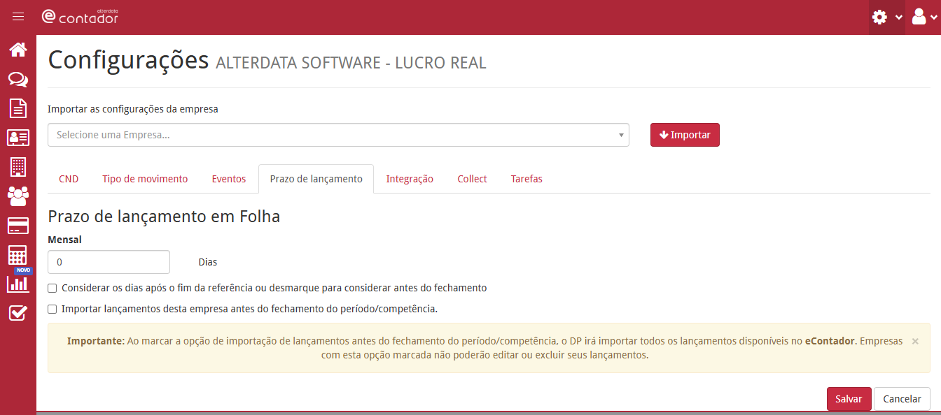 - Acesse a aba Prazo de Lançamento e verifique o Prazo de lançamento em folha;