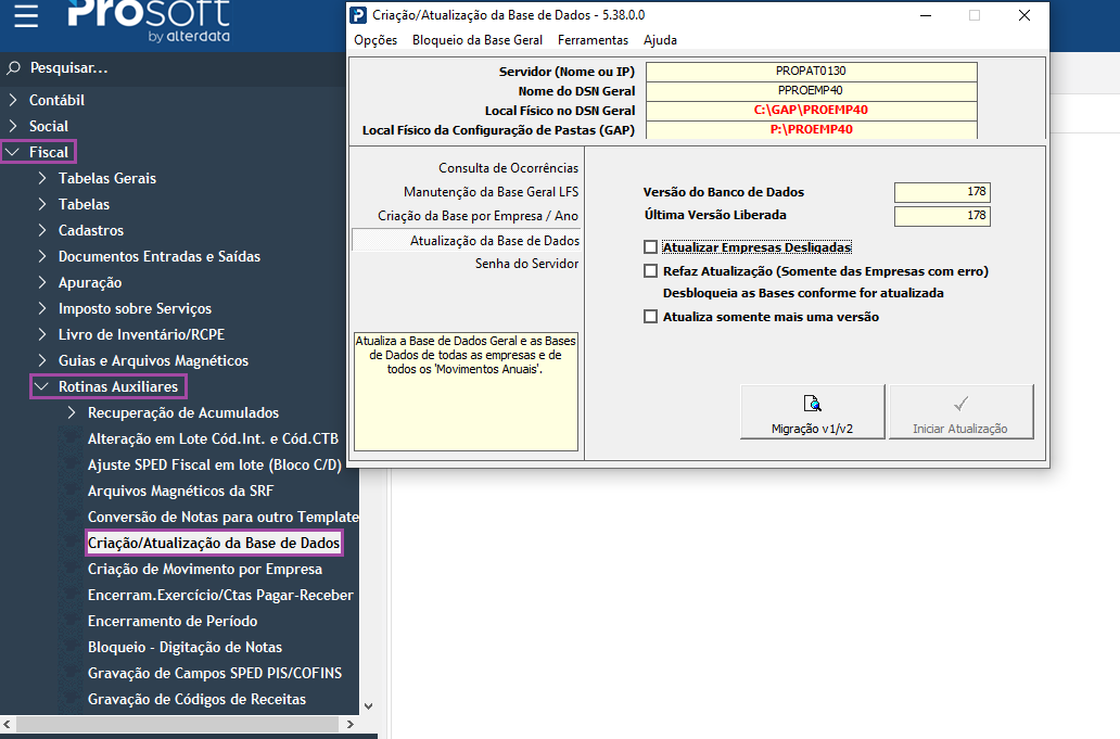 1- Acesse Fiscal > Rotinas Auxiliares > Criação/Atualização da Base de Dados