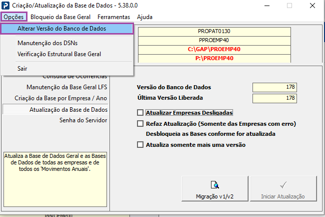 2- Na barra superior clique em Opções e selecione Alterar Versão do Banco de Dados