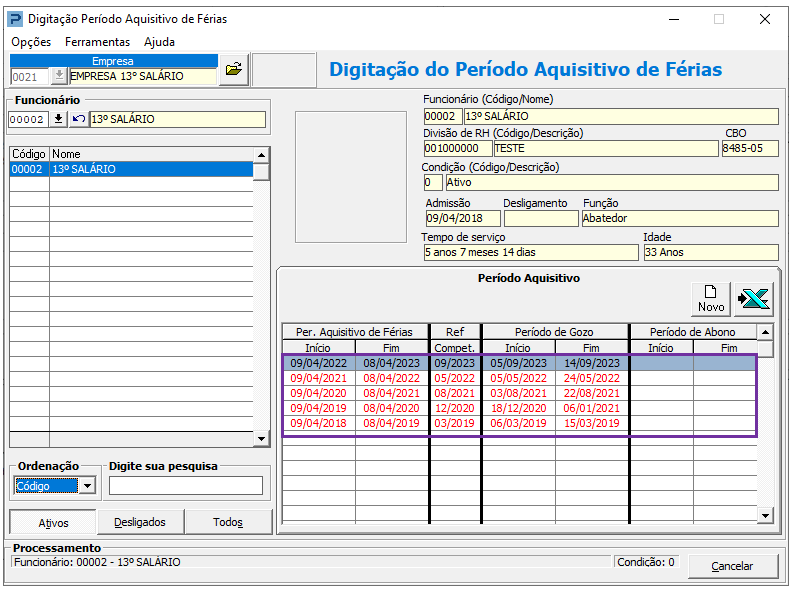 Importante: Todos os períodos aquisitivos devem estar completos e lançados com o saldo quitado.