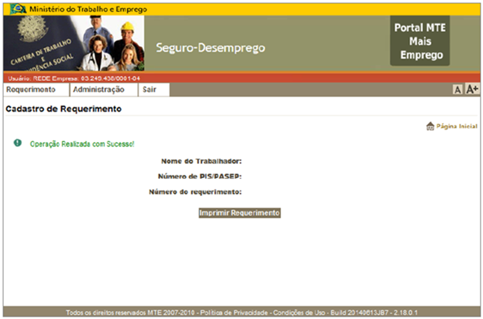 Caso o preenchimento seja realizado de forma correta, uma mensagem de sucesso é exibida, com algumas informações referentes ao trabalhador e a opção para Impressão do Requerimento.
