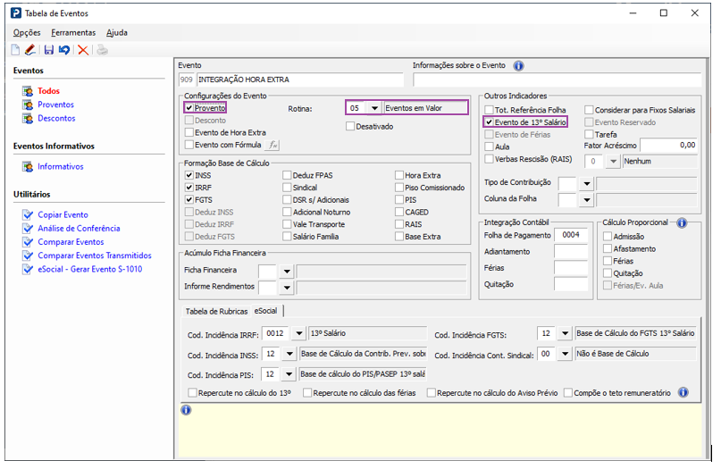 2- Verifique se o Evento de Integração de Horas Extras está parametrizado corretamente: