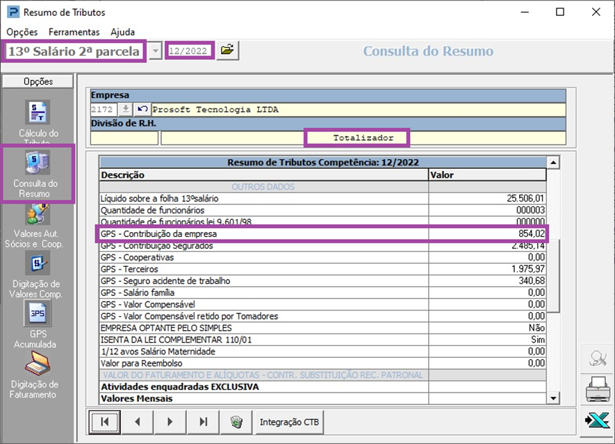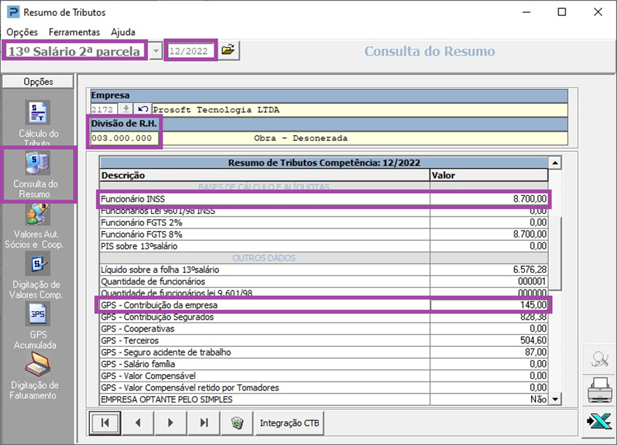 Para o cálculo da Contribuição Previdenciária Patronal (GPS – Contribuição Empresa), será considerado o valor relativo à “Base de Cálculo do INSS Patronal – 13º Salário (Não Desonerado)”.