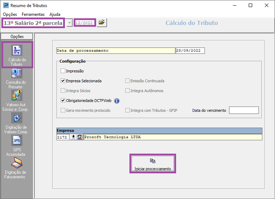 1- Acesse: Social > Folha de Pagamento > Processamentos > Processamento de Recibos/Resumos > Resumo de Tributos