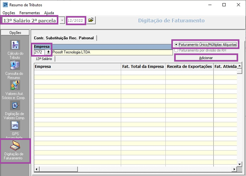 2- No resumo da 2ª parcela de 13º Salário, aba Digitação de Faturamento, informar a empresa e adicionar.