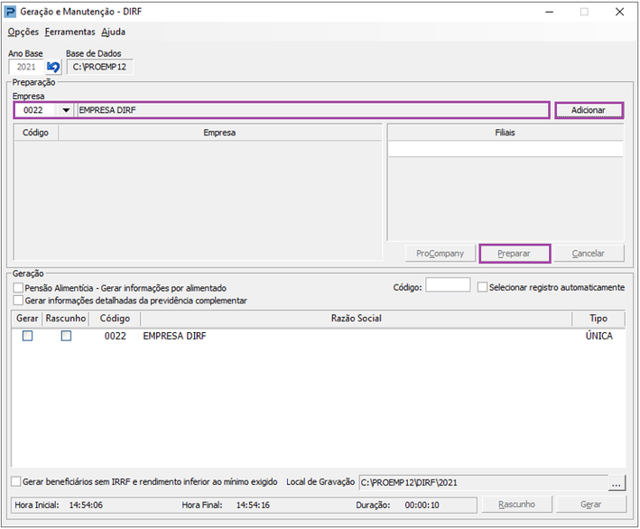 2- Informe o Ano Base e o Código da Empresa. Caso deseje gerar o arquivo para mais de uma empresa, deixe o campo em branco, em seguida clique em Adicionar.