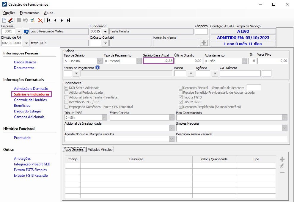 1- Acesse: Social > Folha de Pagamento > Manutenção de Arquivos Funcionais > Cadastro de Funcionários > Aba Salários e Indicadores