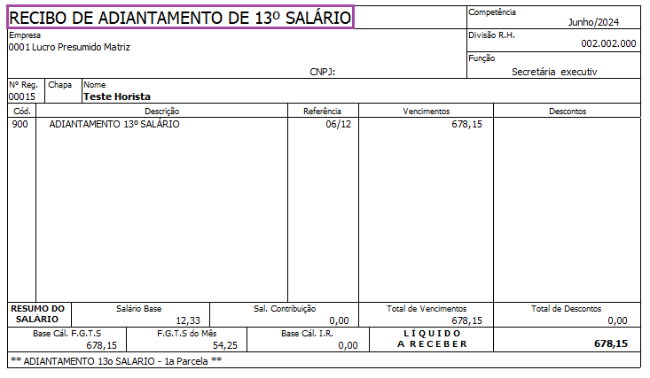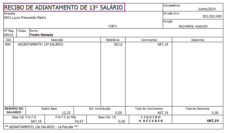 Cálculo realizado no Recibo de Adiantamento 13° Salário: