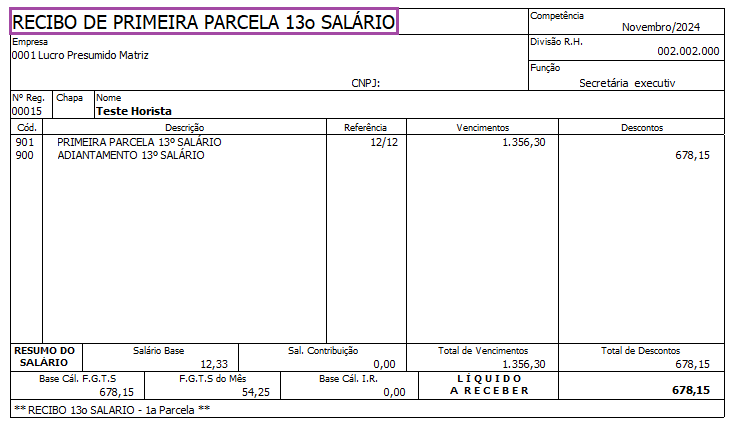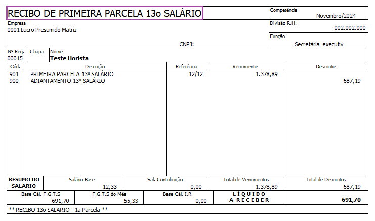 Cálculo realizado no Recibo de Primeira Parcela de 13° Salário: