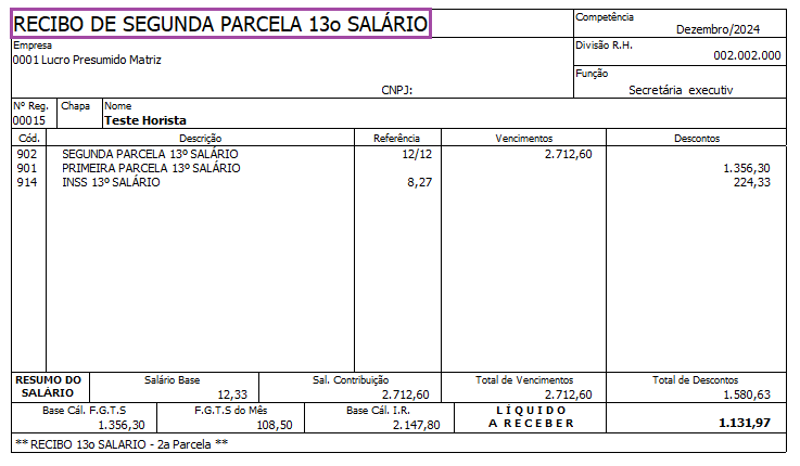 Cálculo realizado no Recibo de Segunda Parcela de 13° Salário: