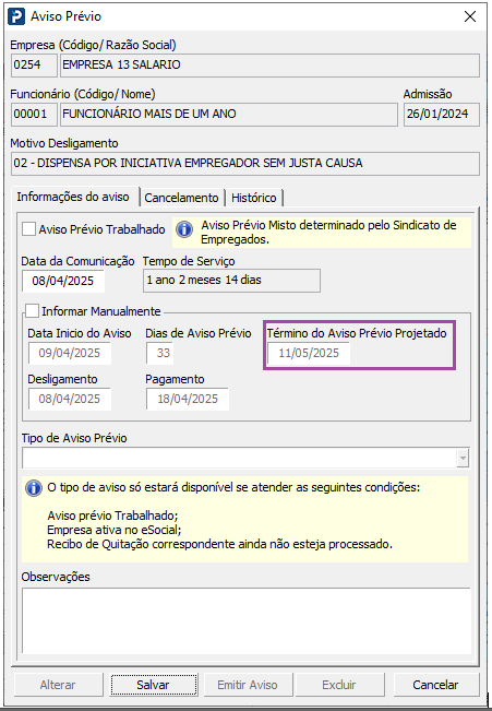 No campo 13º Salário aviso prévio indenizado 01/12 avos (o cálculo será realizado após um (01) dia da data de desligamento 09/04/2025 até o término no aviso prévio projetado 11/05/2025).