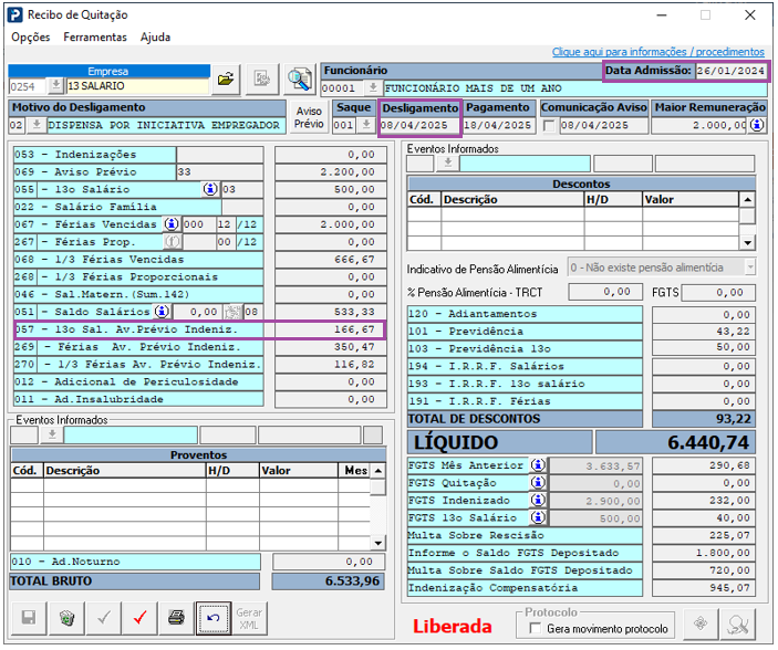No campo de 13º salário são demonstrados 03/12 avos (o cálculo será realizado de 01/01/2024 até a data do desligamento 08/04/2025).