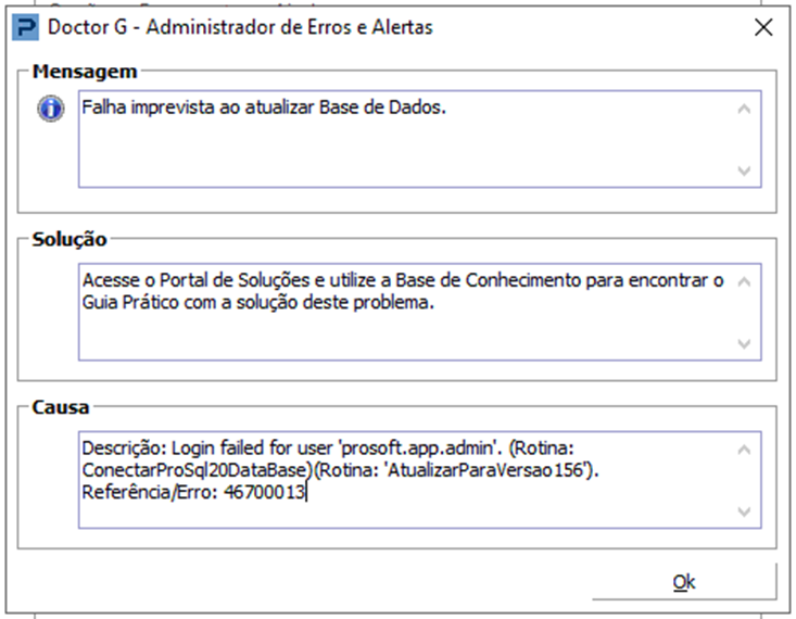 Descrição: Login failed for user 'prosoft.app.admin'. (Rotina: ConectarProSql20DataBase)(Rotina: 'AtualizarParaVersao156').