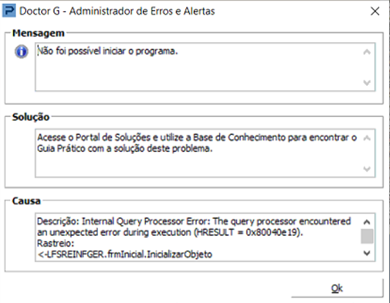 Ao abrir a rotina do Gerenciador em EFD-REINF, retorna a mensagem de erro:Descrição: Internal Query Processor Error: The query processor encountered an unexpected error during execution (HRESULT = 0X80040e19)Rastreio:<-LFSREINFGER.frmInicial.InicializarObjeto