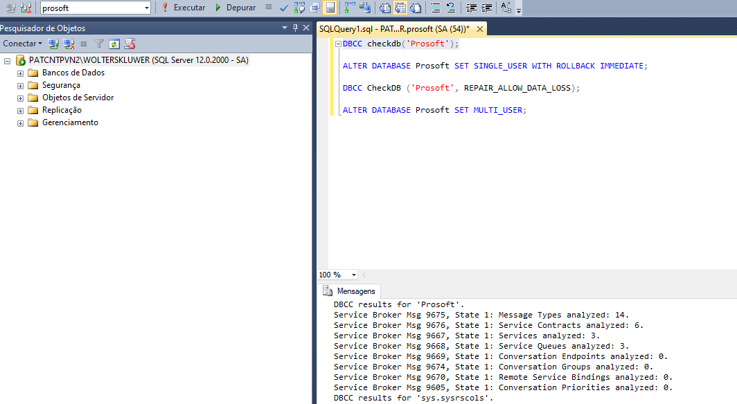 DBCC CheckDB ('Prosoft', REPAIR_ALLOW_DATA_LOSS);