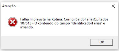 Contexto: Este artigo orienta sobre como corrigir a mensagem: Falha Imprevista na Rotina: CorrigirSaldoFeriasQuitados - 107513 - O conteúdo do campo 'IdentificadorFerias' é inválido, ao abrir as rotinas do social.