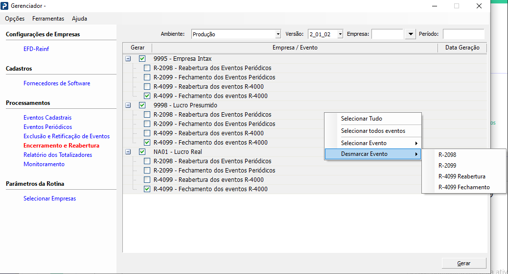 Este guia tem por objetivo orientar o usuário, como configurar na rotina do Gerenciador do Reinf para marcar e desmarcar vários eventos de uma vez.