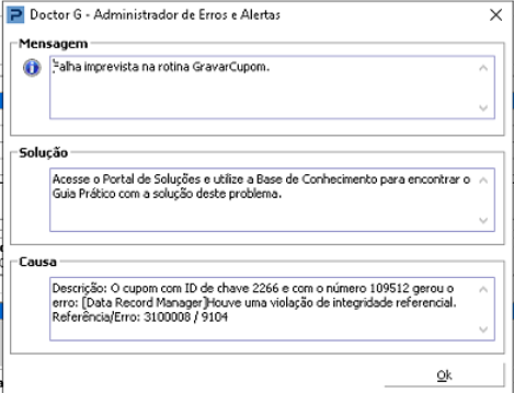 Descrição: O cupom com ID de chave NNN e com o número NNNNN gerou o erro: [Data Record Manager]Houve uma violação de integridade referencial. Referência/Erro: 3100008 / 9104