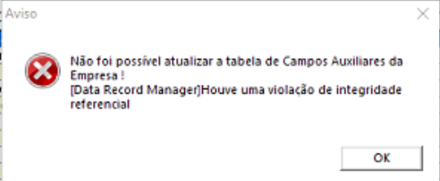 Não foi possível atualizar a tabela de Campos Auxiliares da Empresa! Data Record manager Houve uma violação de integridade referencial