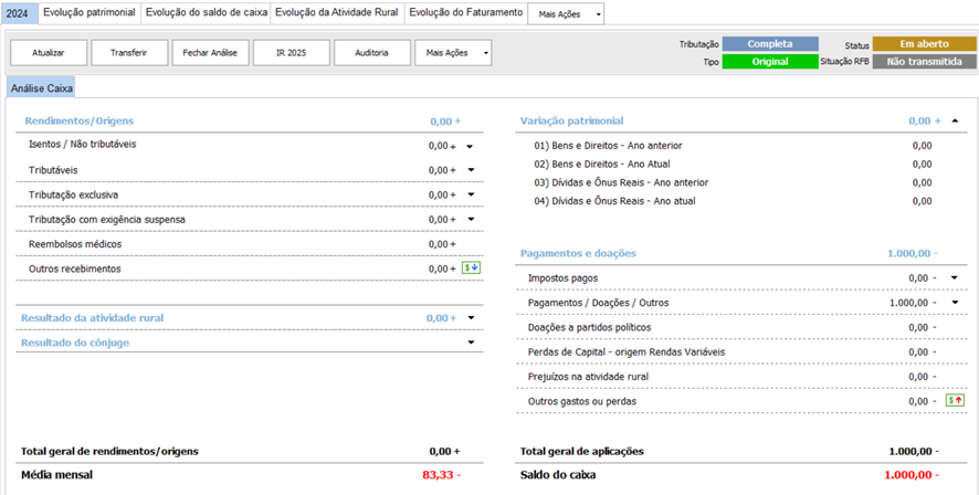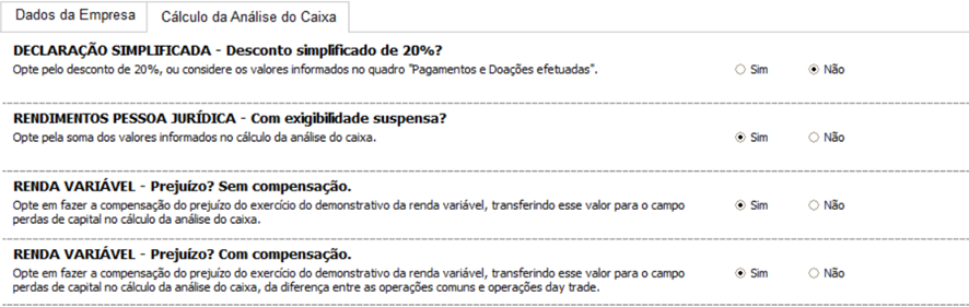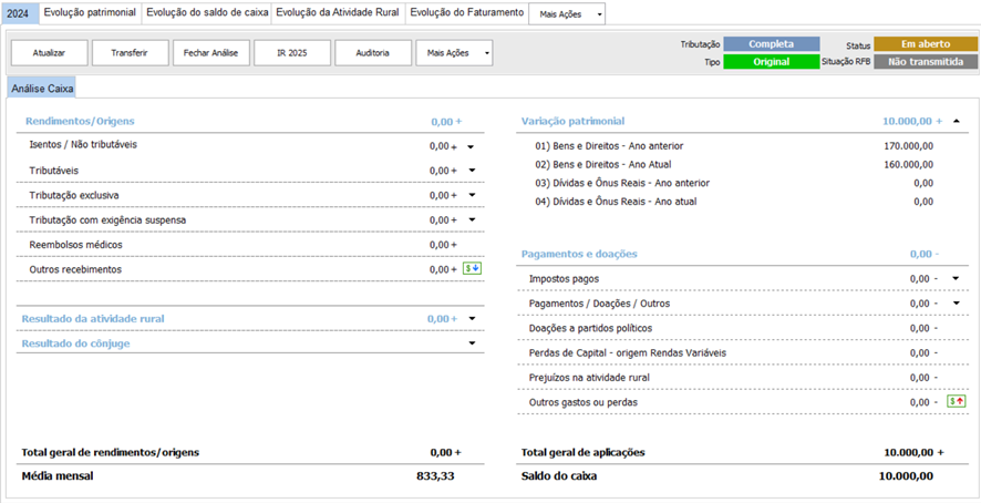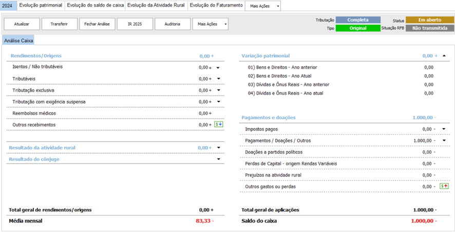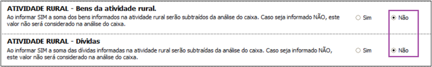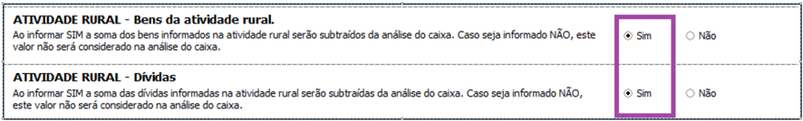 Nesta opção de parâmetros o valor de bens e dívidas da atividade rural NÃO serão considerados na análise de caixa, alterando o valor do Resultado de atividade rural.