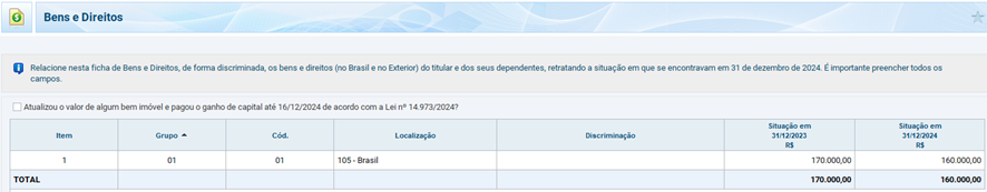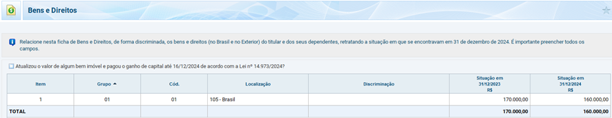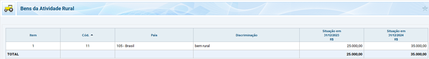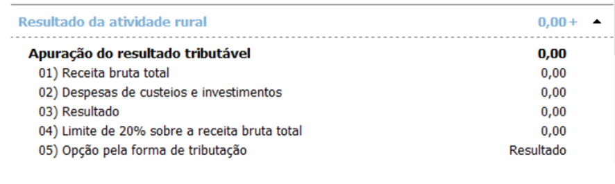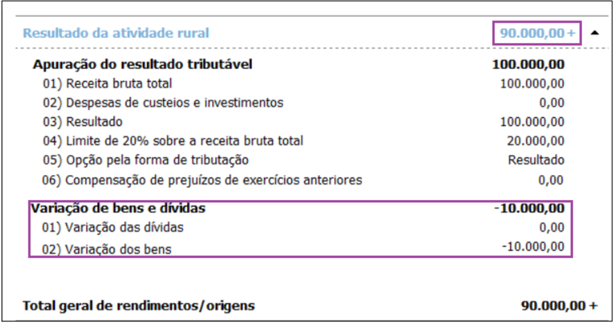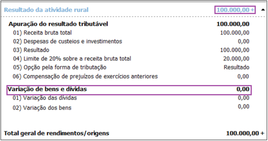 O sistema vai receber os valores da receita federal e fazer os cálculos conforme os valores apresentados no grid, a diferença é quando temos valores de variação de patrimônio de bens da Atividade rural
