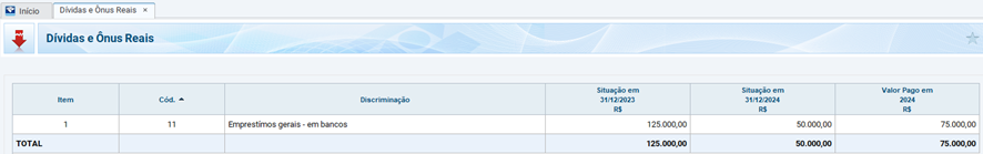 Neste caso tivemos o aumento no caixa referente a diferença de 31/12/2023 e 31/12/2024, que foi de 75mil