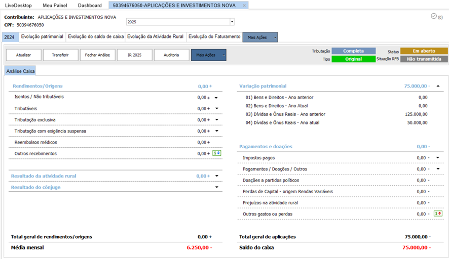 A análise de caixa efetua a demonstração de todos os rendimentos, pagamentos realizados durante o exercício e variações do patrimônio, calculando no final se a renda dos contribuintes está compatível ou não.