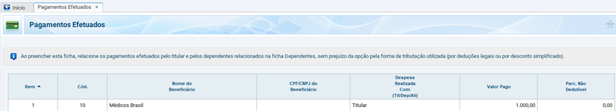 Neste tópico entram informações como, impostos, pagamentos gerais como médicos, doações, perda de capital ou atividade rural*