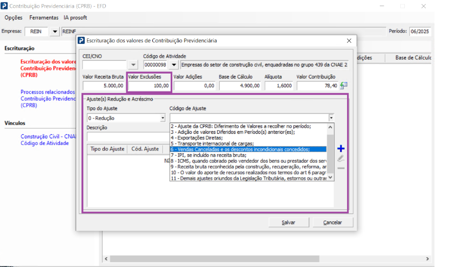 Como informar devolução/exclusão/redução de valores na rotina Contribuição Previdenciária (CPRB)