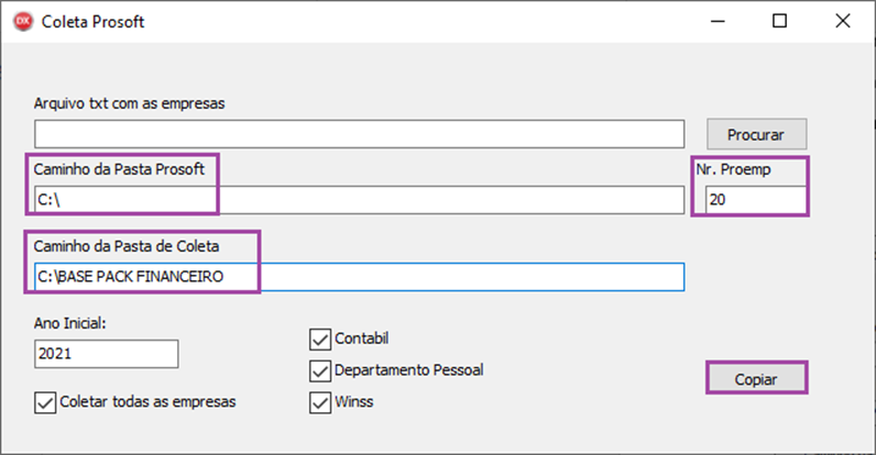 - Execute o programa Coleta_Prosoft.exe, preencha os campos e clique em Copiar: