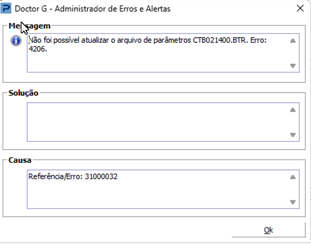- Não foi possível atualizar o arquivo de parâmetros CTB021400.BTR Erro: 4206 Erro: 31000032