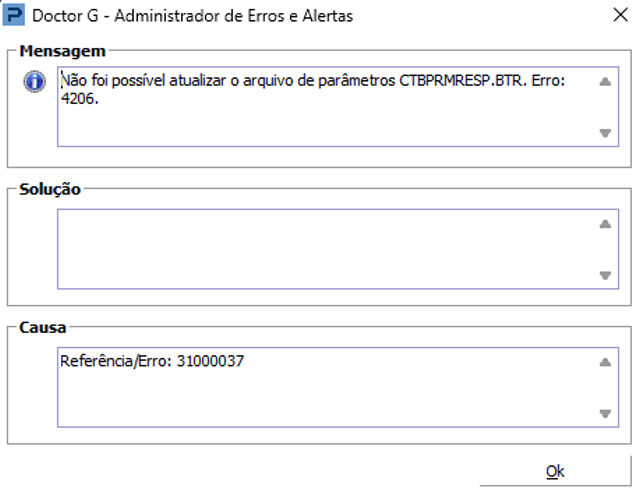 - Não foi possível atualizar o arquivo de parâmetros CTBPRMRESP.BTR Erro 4206. erro 31000037