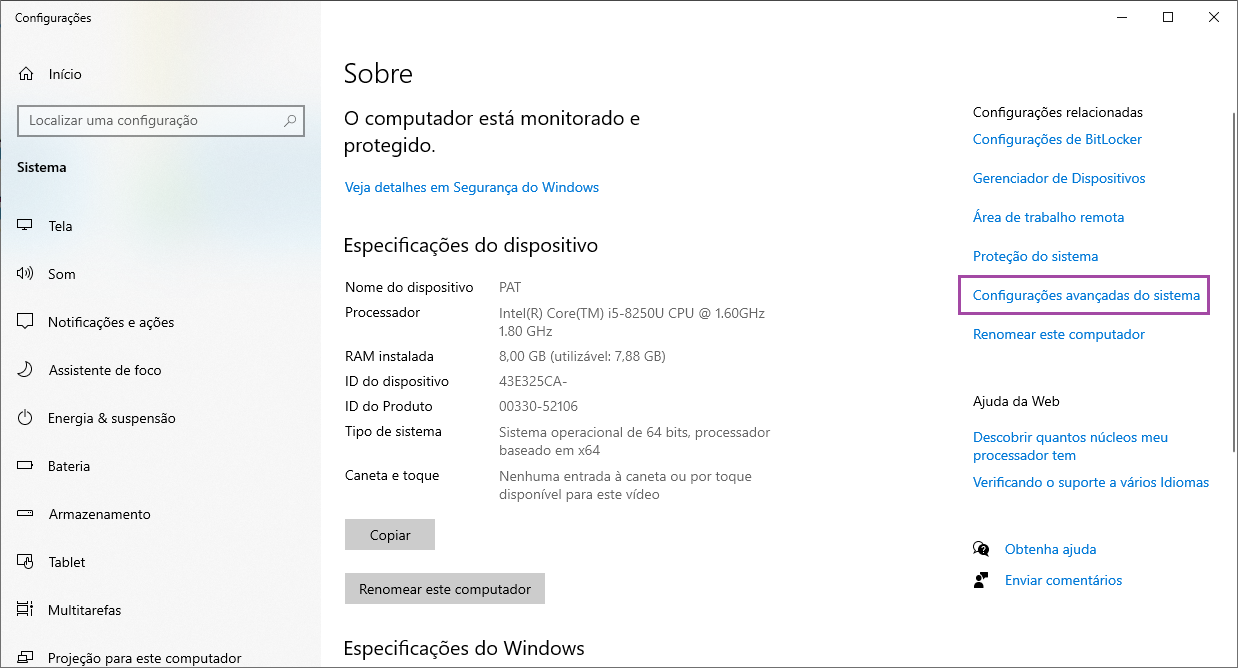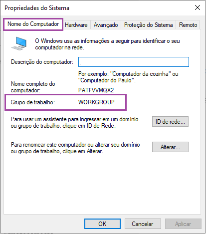 3- Na aba Nome do Computador, o campo Grupo de Trabalho se refere a permissão do domínio. O print a seguir é um exemplo.