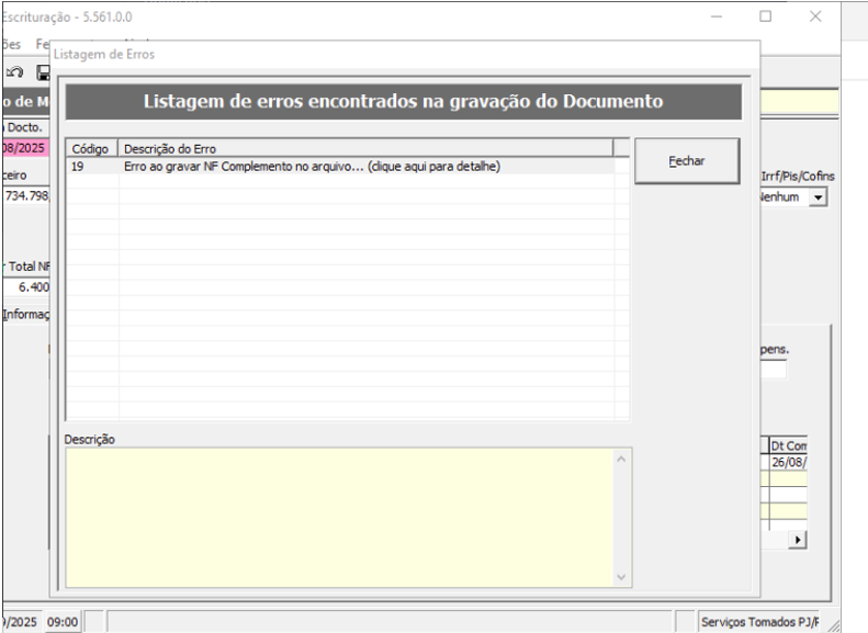 Ao tentar salvar nota fiscal na rotina Escrituração do modulo Fiscal é apresentado erro:
