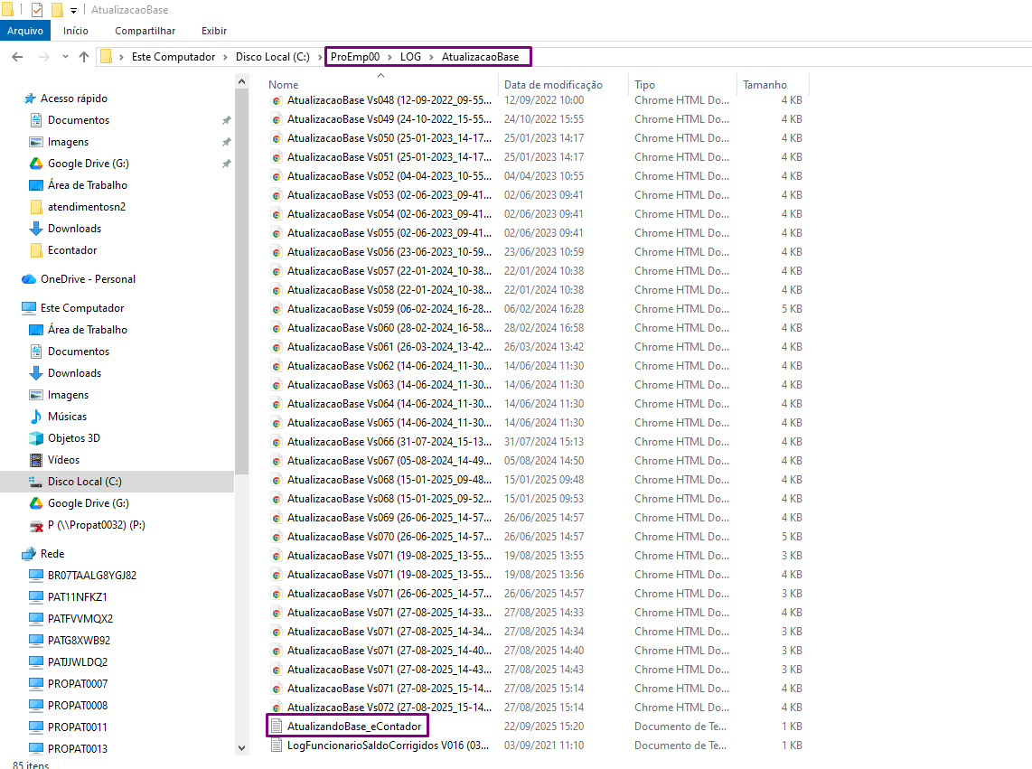 - Acesso o caminho:X\ProEmpXX\LOG\AtualizacaoBase ( onde X Corresponde ao disco de rede do Prosoft)