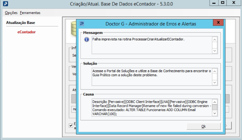 A2221-Econtador- Atualização da base de dados apresenta erro: Descrição [Pervasive][ODBC Client Interface][LNA][Pervasive][ODBC Engine Interface]Referência/Erro: 81400000
