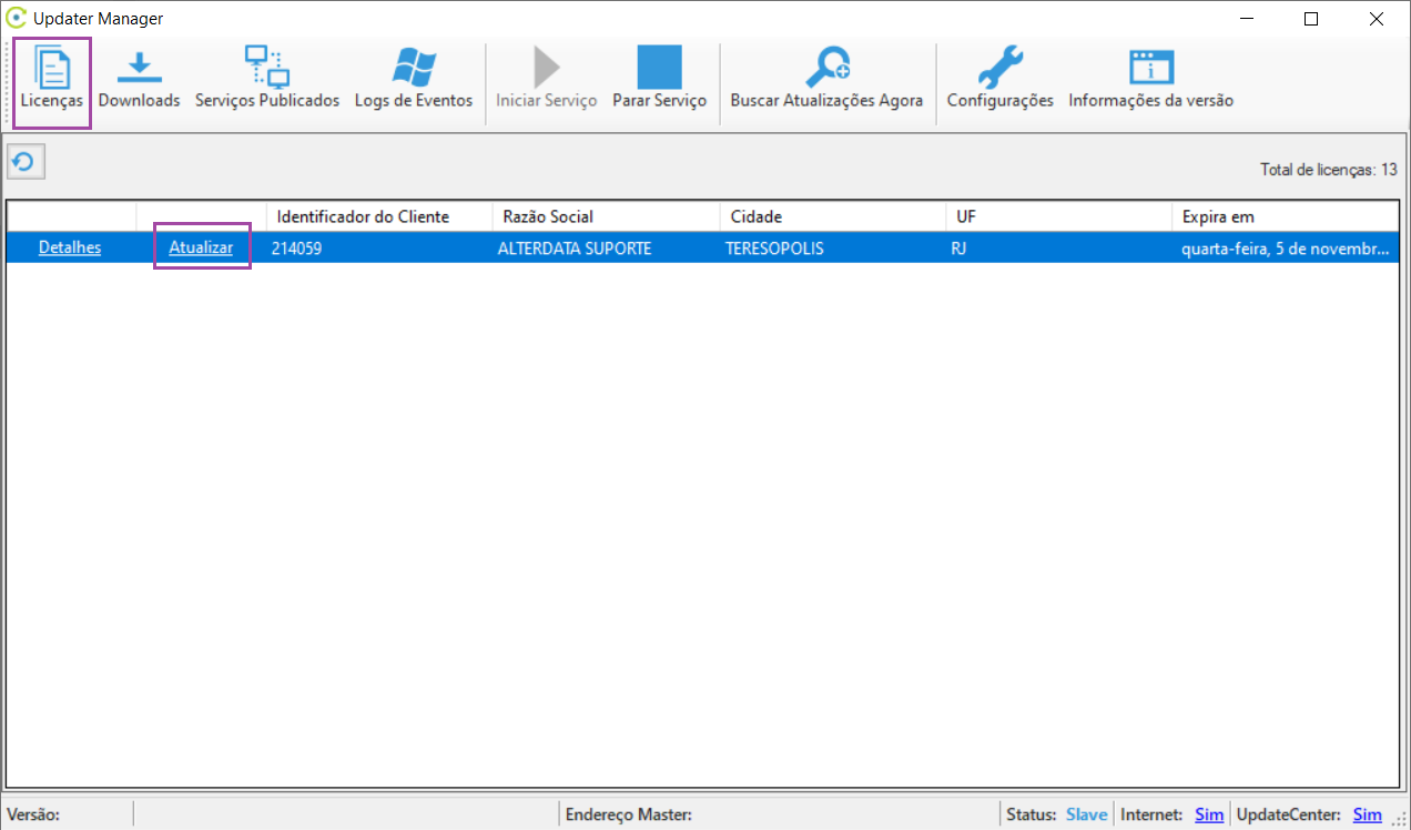 3 - Clique em Licenças e depois Atualizar.