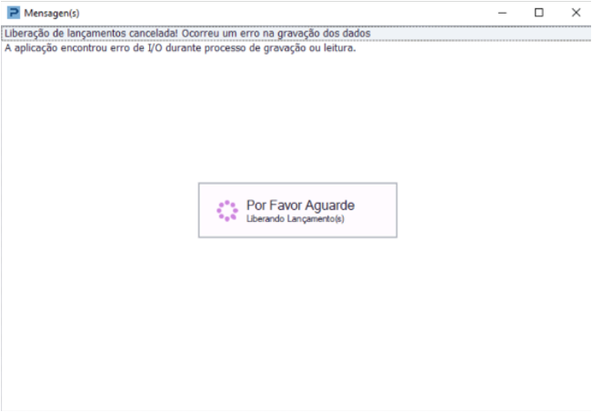 Este artigo orienta quando ao tentar liberar lançamento para a contabilidade na rotina Importação Excel exibe mensagem "Liberação de lançamento cancelada! Ocorreu um erro na gravação dos dados. A aplicação encontrou um erro de I/0 durante o processo de gravação ou leitura.