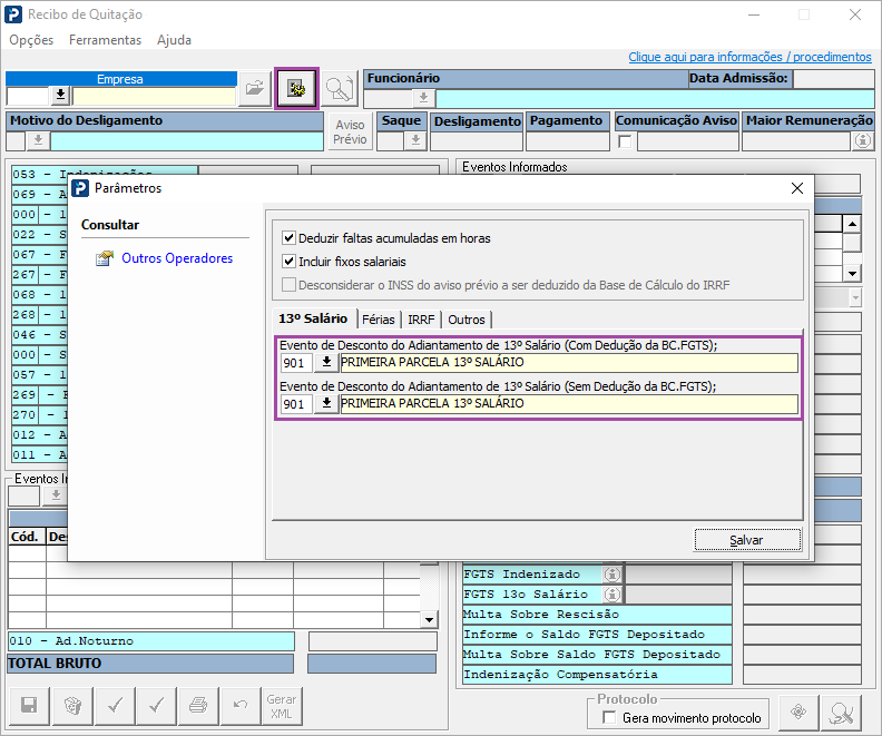 2- Ao clicar nos Parâmetros de Quitação (engrenagem) é verificado que o evento 901 está indevidamente duplicado