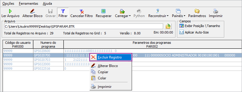4- Clique com o botão direito sobre a linha e selecione Excluir Registro.