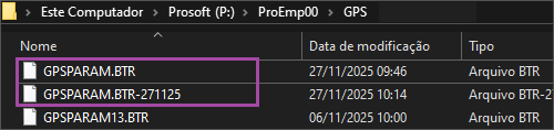 1 - Renomeei o arquivo original GPSPARAM.BTR alterando o final com arquivo com a data do dia (no exemplo foi feito em 27/11/2025).