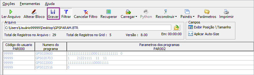 2- Ache o código do usuário com o problema (no exemplo é o 99999) e o número do programa GPS020700.