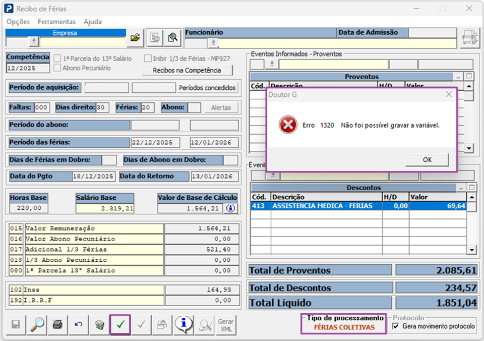 Este artigo orienta sobre como corrigir a inconsistência apresentada durante a validação dos recibos de férias normais e coletivas, na qual é exibida a mensagem “Erro 1320 – não foi possível gravar a variável”.