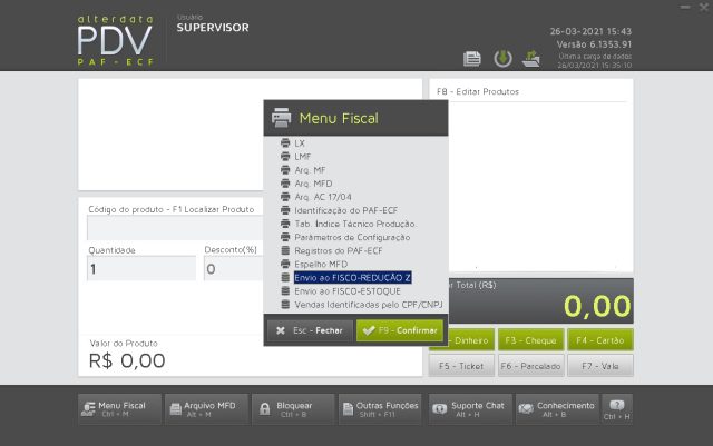 Acesse o PDV Alterdata e vá em Menu fiscal;
