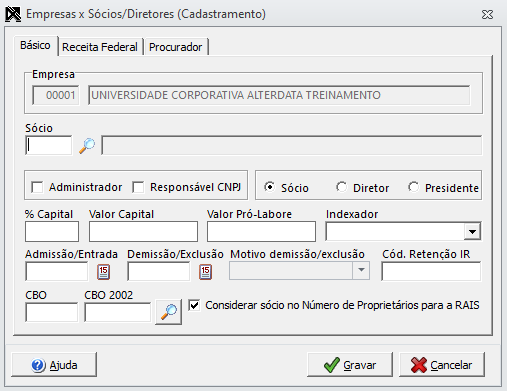 - Na aba Receita Federal forneça as informações referentes a este sócio e que poderão ser utilizadas nos relatórios pertinentes a DIPJ que serão emitidos pelos sistemas Alterdata;