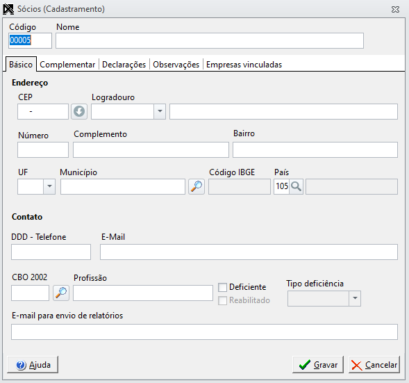 - Na aba Básico deverá preencher com informações como Endereço, Contatos, CBO deste sócio;