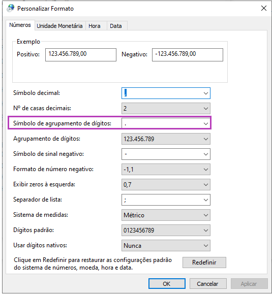 Em configurações adicionais verifique o "Símbolo de agrupamento de dígitos"