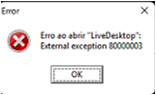 Ao tentar abrir o programa Analir é exibido erro: “Erro ao abrir “LiveDesktop”: External exception 80000003”.