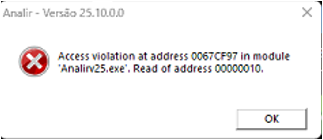 Ao clicar em 'ok' exibe mensagem: access violation at address 0067CF97 in module ‘Analirv25.exe’. Read of address 00000010.