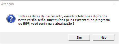 Quando o programa IRPF for liberado, essas informações serão preenchidas automaticamente do IRPF para o programa Analir. Ao clicar em "atualizar" será exibida mensagem abaixo: